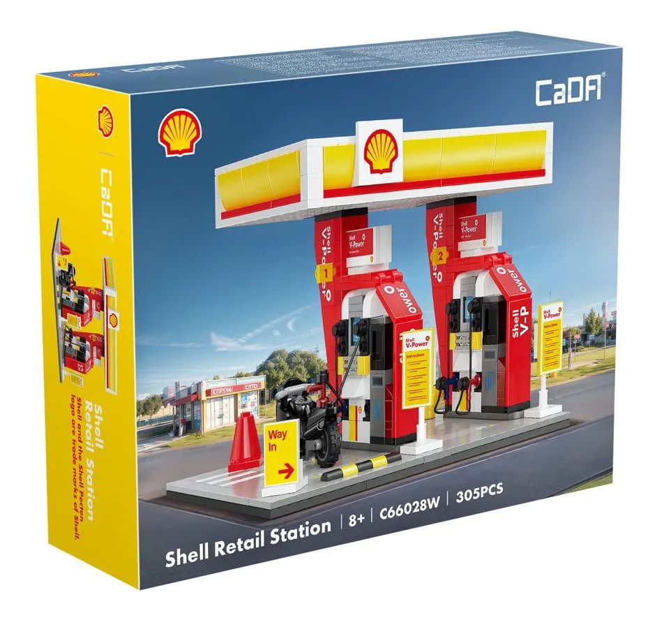 Este kit recria em detalhes uma estação de abastecimento Shell V-Power, incluindo bombas de combustível, sinalizações, cobertura e até uma mini moto para completar a cena. Compacto e envolvente, é perfeito para quem ama blocos de montar, veículos e cenários urbanos.